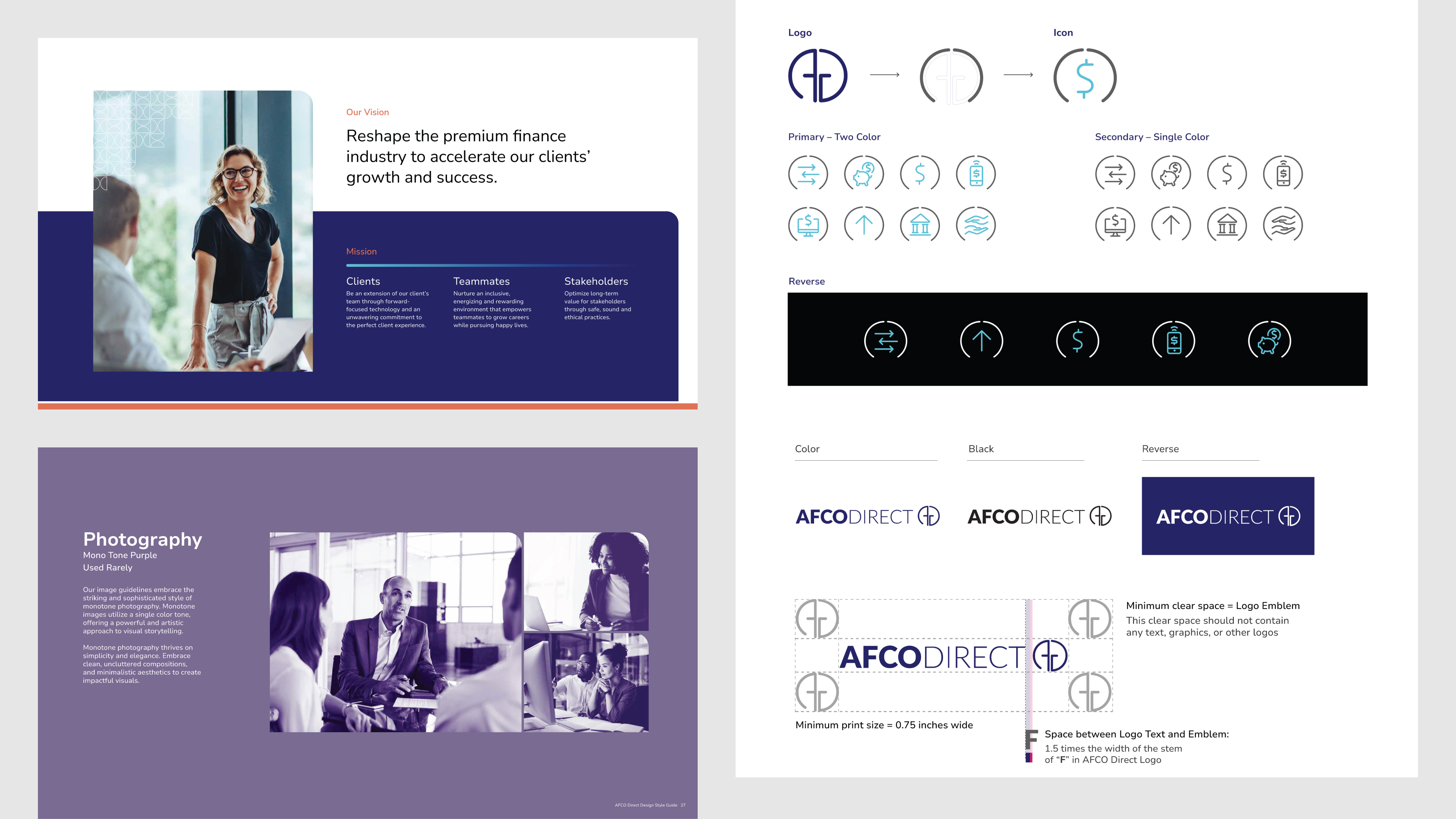 Brand refresh for an insurance premium finance company. Enhanced visuals with logo design, guidelines, iconography and photography for a distinctive identity
