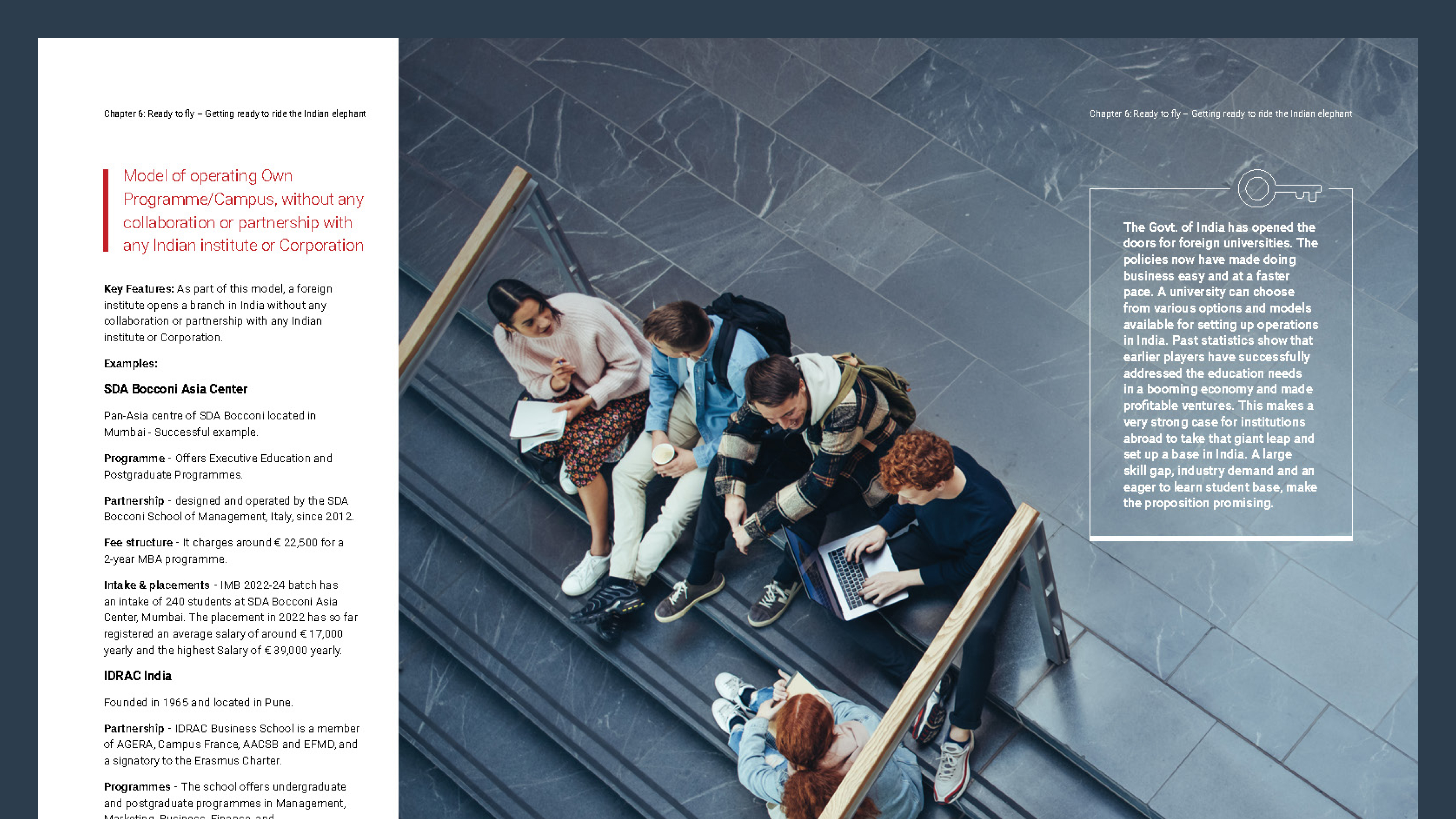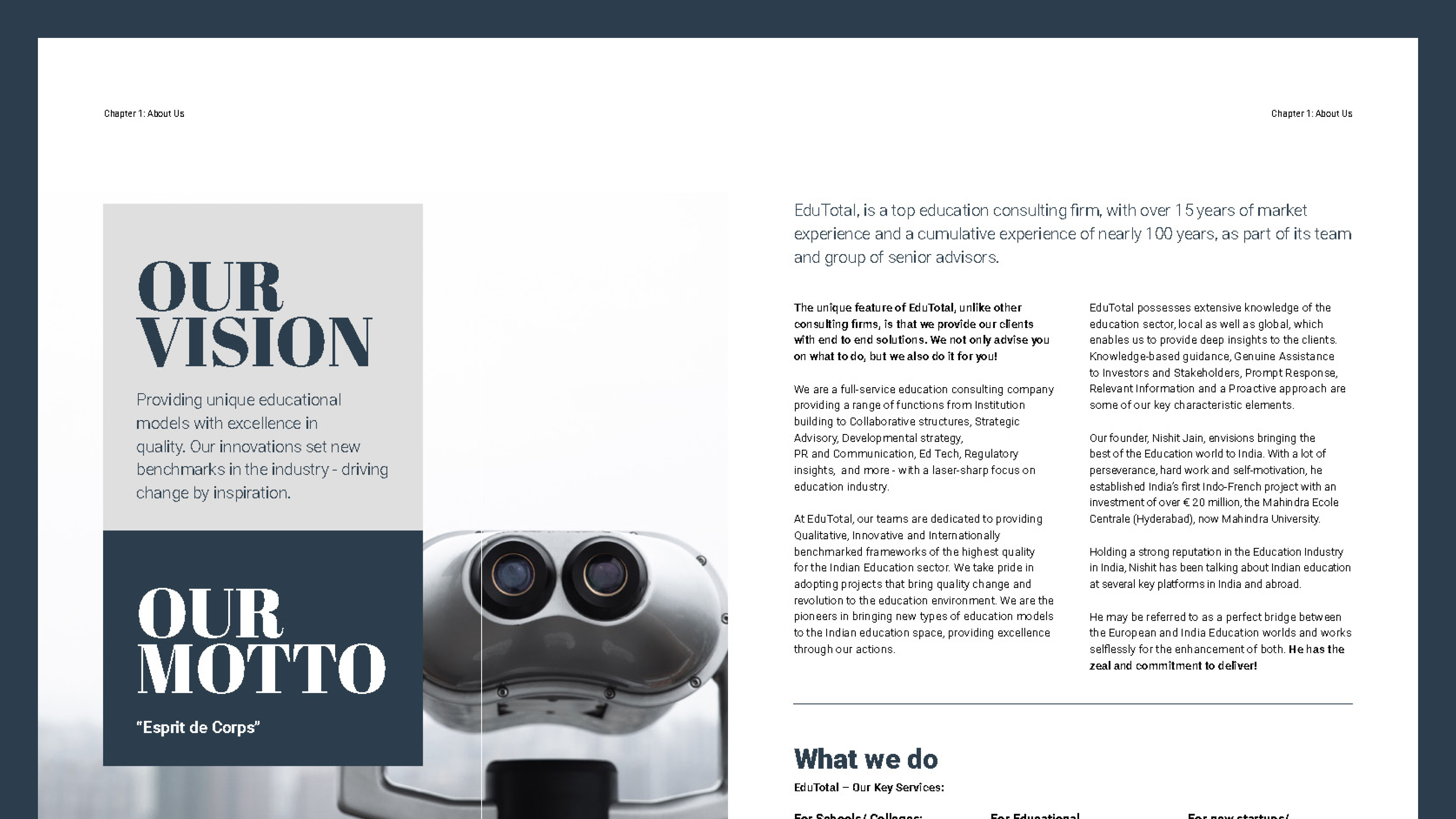 Brochure creation for an education consulting firm. Long-form collateral featuring infographics and striking visuals to complement the content