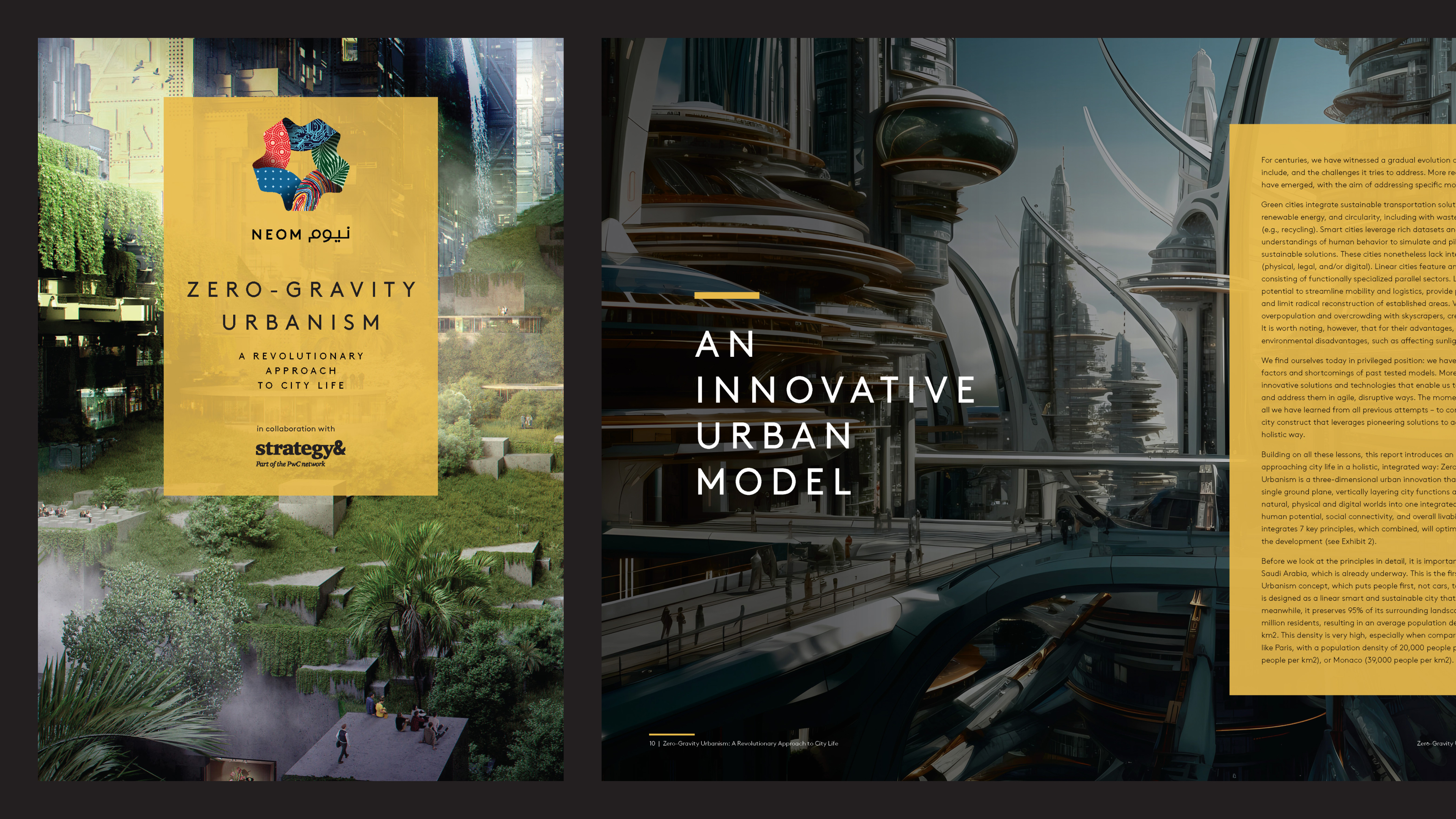 Brochure design for a new urban area development in Saudi Arabia. Imagery that reflects futuristic models and plans, and explains concepts of sustainability in smart city projects